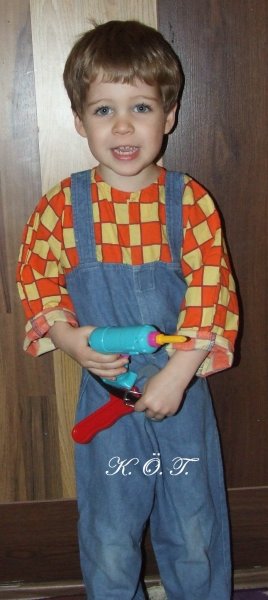 Elsőként az egyik turi 100 forintos kosarában találtunk neki egy Bob mesteres kezeslábast (kertész farmer és piros-sárga kockás ing kombó). Nem vagyok híve a vett jelmeznek, de ennyiért (eredeti marks&spencer-es) ez még játszó ruhának is jó. Viszont miután haza vittük, igazán nem is érdekelte, aznap még ráadni se tudtam csak egy héttel később. Végül kölcsön adtuk egy csoporttársának, aki pont ilyesmit keresett és ott nagy örömöt okoztunk vele :-).