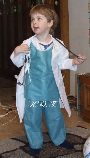 A köpeny már 2 nap múltán ott figyelt egy fogason (első nap kiszabtam, másnap összevarrtam). Volt egy fehér lepedőm, ami a használattól a közepén már elvékonyodott/elhasadt de a széleiből tökéletesen kijött amit elterveztem. Alá pedig Apósom hozott egy készlet zöld műtős papír szettet a munkahelyéről, ezt szabtam át xl-es felnőtt méretből 92-es gyerekméretbe, szerencsére ugyan úgy varrható mint bármilyen anyag. Szabásmintának egy pólóját és egy nadrágját használtam fel, de fontos bőven ráhagyni mert ezek nem rugalmasak így nehéz belebújni. Sztetoszkóp a nyakba, néhány kötszer a zsebébe és kész is a mi kis “Doktorbácsink”. A fotón a főpróbát láthatjátok, annyira tetszett neki, hogy levenni is alig akarta, egyből ágyba parancsolt és nekiállt gyógyítgatni 🙂